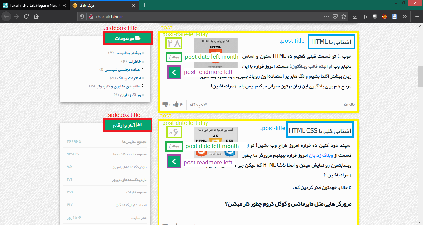 تو تصویر بالا هر قسمت رنگی مشابه یک کلاس مشترک دارن که کنارشون اسمش رو هم نوشتم. یعنی اون دستورات و ویژگی ها تو هر قسمت تکرار میشن. مثلا کلاس مربوط به .sidebox-title این دستور رو داره بک گراندش سبز باشه و رنگ متنش سفید. خوبی این کار چیه؟ لازم نیست هعی مجددا کد نویسی کنین و دستورات تکراری رو برای هر قسمت بنویسین. میتونین یک کلاس تعریف کنین که بگه آقا من هر کجا اعمال شدم رنگ اون قسمت رو سبز کن! و مزیت دیگش این هست که خیلی راحت میتونین دستورات اون کلاس ها رو هر جوری که دوست دارین عوض کنین. مثلا من میتونم با مراجعه به فایل CSS قالبم و پیدا کردن کلاس post-readmore-left رنگ پس زمینه اون قسمت ها رو از سبز به آبی تغییر بدم. (تو قسمت های بعدی نحوه پیدا کردن این چیزا رو یاد میگیریم.)