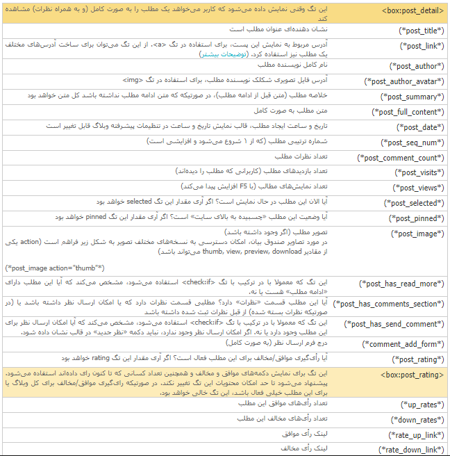 تگهایی که من استفاده کردم (*post_title*) و (*post_full_content*) هستش که به ترتیب برای نمایش عنوان پست و محتویات پست استفاده میشن (در حقیقت متن عنوانتون به جای اون تگ میشینه). اینجا میتونین به همون راهنمای کدهای وبلاگ مراجعه کنین تا ببینین از چه تگهای دیگه میشه استفاده کرد. به عنوان نمونه (*post_image*) برای تصاویر استفاده میشه و لینک تصویر رو به ما میده.