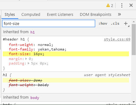و یا روش بهتر اینه که تو قسمت استایل های CSS به پایین بریم تا ببینیم اندازه فونت از عنصری به ارث رسیده؟ و اگر بله امکان تغییرش هست یا نه. مثلا من تو کد این رو پیدا کردم (میتونین از جعبه که توش filter نوشته استفاده کنین تا سریعتر پیداش کنین)